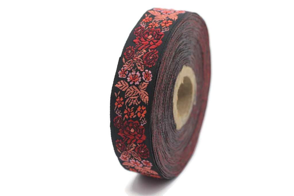 22 mm Red Black Floral Embroidered ribbon (0.86 inches), Vintage Jacquard, Floral ribbon, Sewing trim, Jacquard trim, Jacquard ribbon, 22097