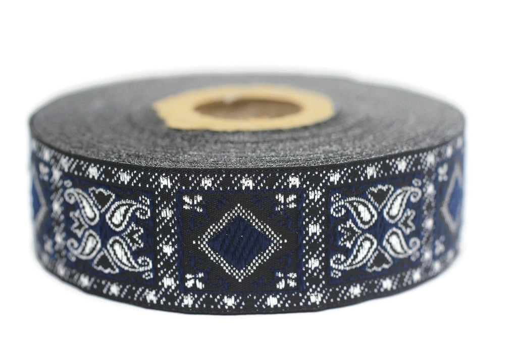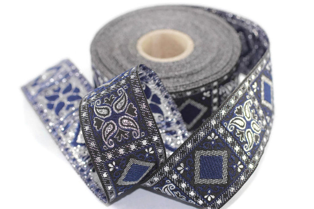 25 mm Blue Silver Geometric Jacquard trim (0.98 inches), vintage Ribbon, Decorative Craft Ribbon, Sewing, Jacquard ribbon, Trim, 25587