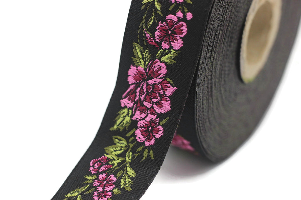25 mm Pink Black Floral Jacquard trim (0.98 inches), vintage Ribbon, Decorative Craft Ribbon, Floral Jacquard Ribbon, Trim, 25096