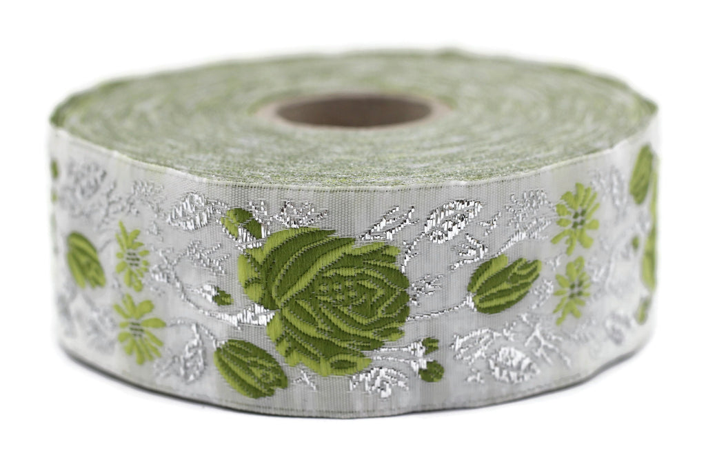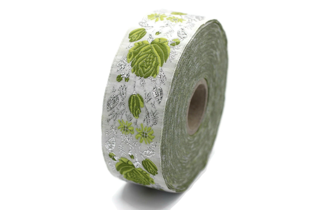 35 mm Green / White Floral Jacquard trim (1.37 inches), vintage Ribbon, Decorative Craft Ribbon, Floral Jacquard Ribbon Trim, 35089