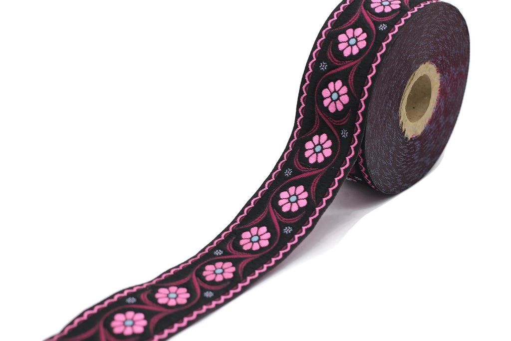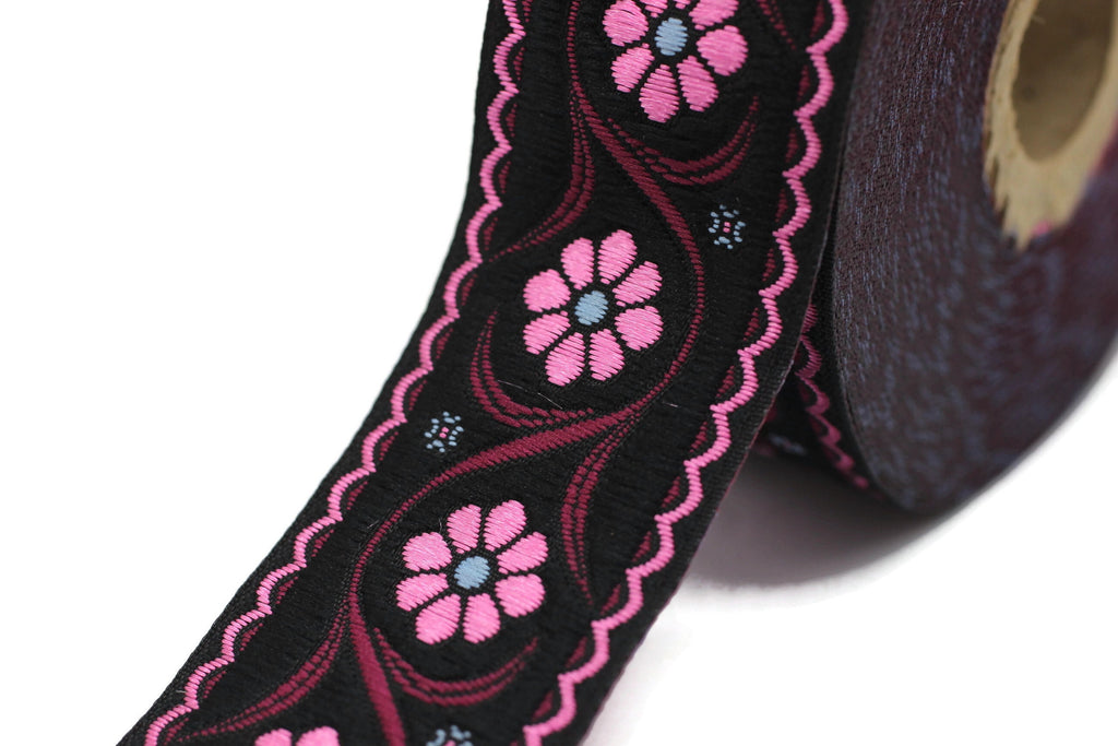 35 mm Pink Daisy Blossom ribbon (1.37 inches), Vintage Jacquard trim, Floral ribbon, Floral trim by the yards, jacquard ribbons, 35938