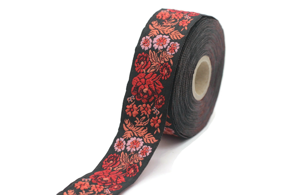 35 mm Red/Black Floral Embroidered ribbon (1.37 inches), trim for sewing, Floral ribbon, Sewing trim, Jacquard trim, Jacquard ribbon, 35097