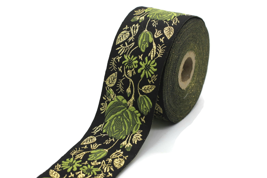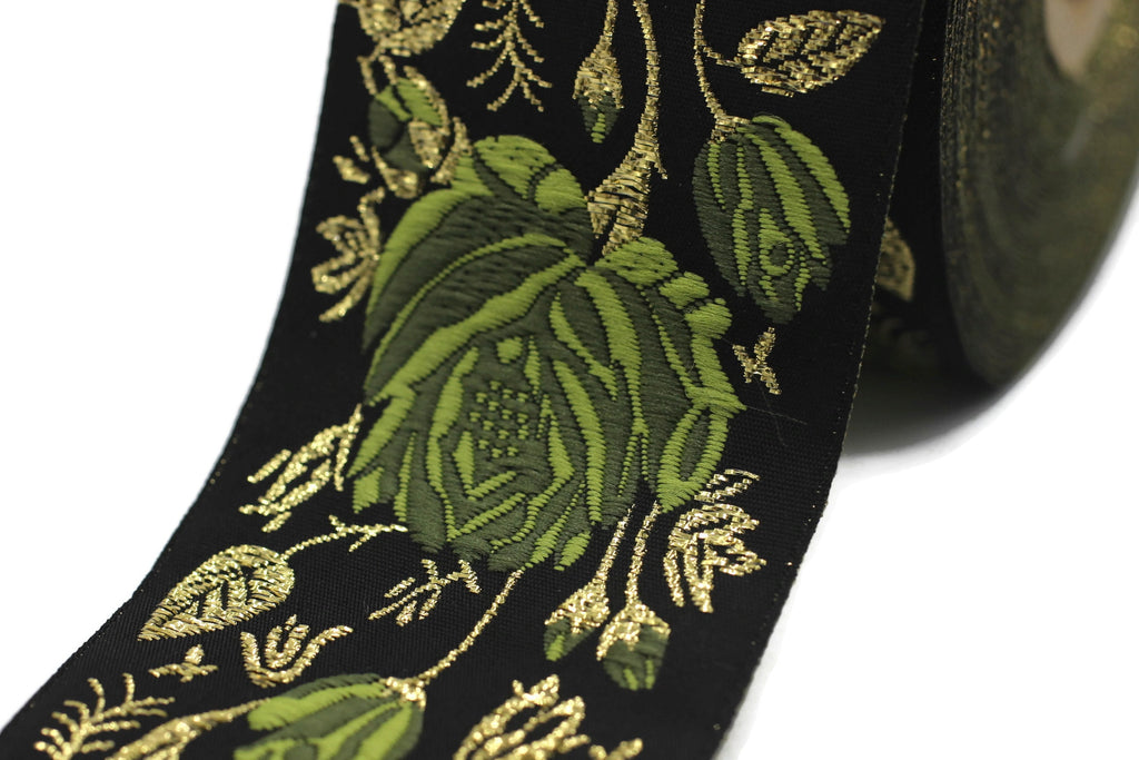 50 mm Green / Black Floral Jacquard trim (1.96 inches) rose embroried Ribbon, Decorative Craft Ribbon, Jacquard Ribbon Trim, 50089