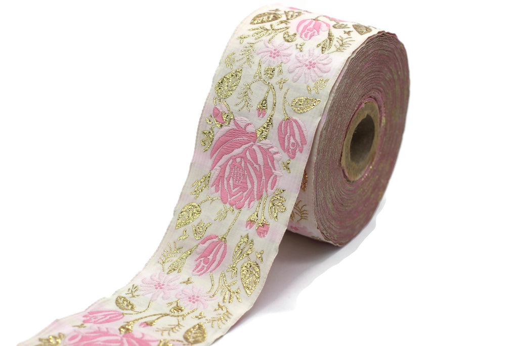 50 mm Pink / White Floral Jacquard trim (1.96 inches), rose embroried Ribbon, Decorative Craft Ribbon, Jacquard Ribbon Trim, 50089