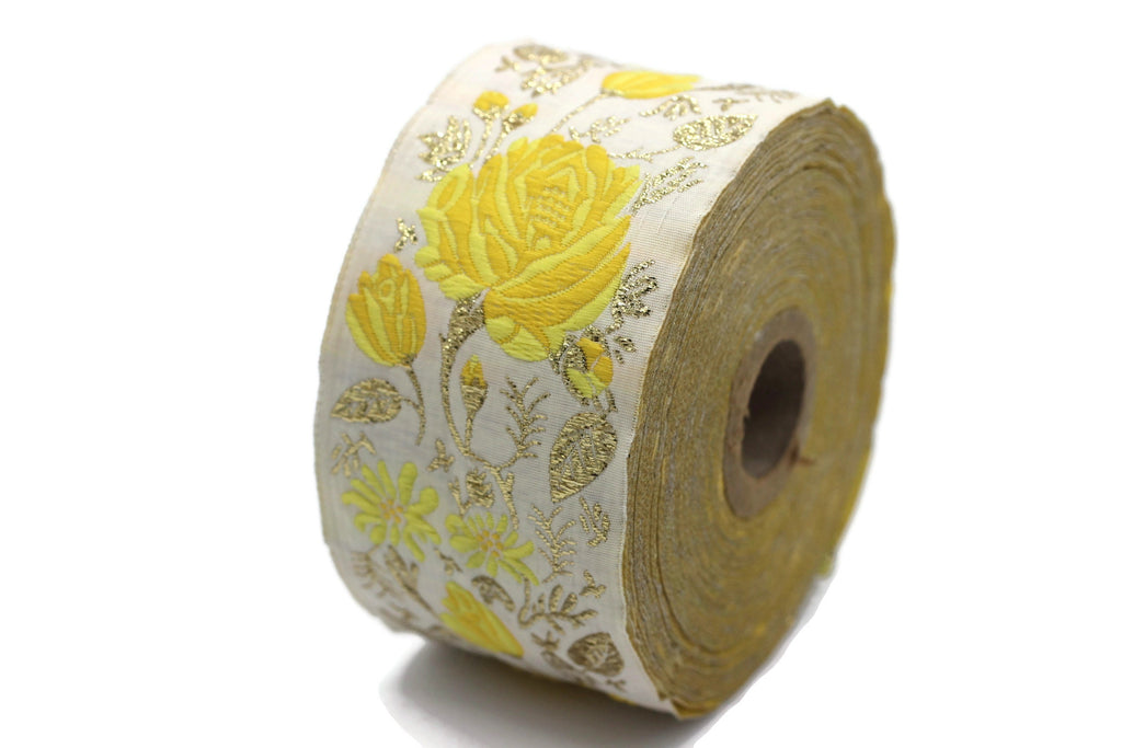 50 mm Yellow / White Floral Jacquard trim (1.96 inches), rose embroried Ribbon, Decorative Craft Ribbon, Jacquard Ribbon Trim, 50089