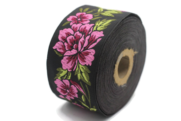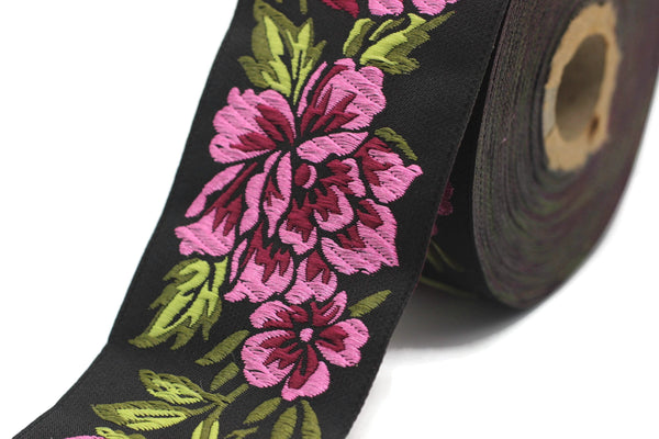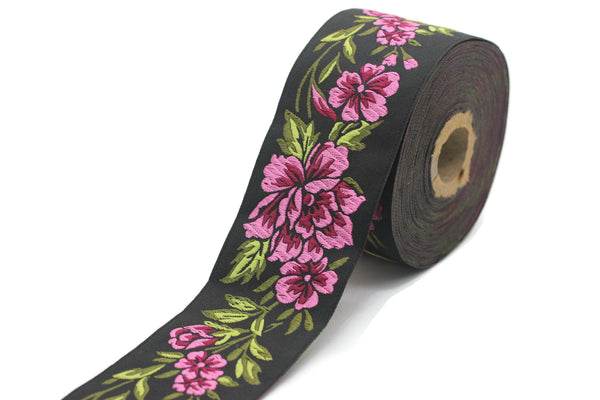 50 mm Pink/ Black Floral Jacquard trim (1.96 inches), vintage Ribbon, Decorative Craft Ribbon, Floral Jacquard Ribbon, Trim, 50096
