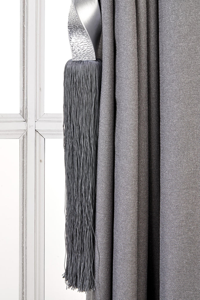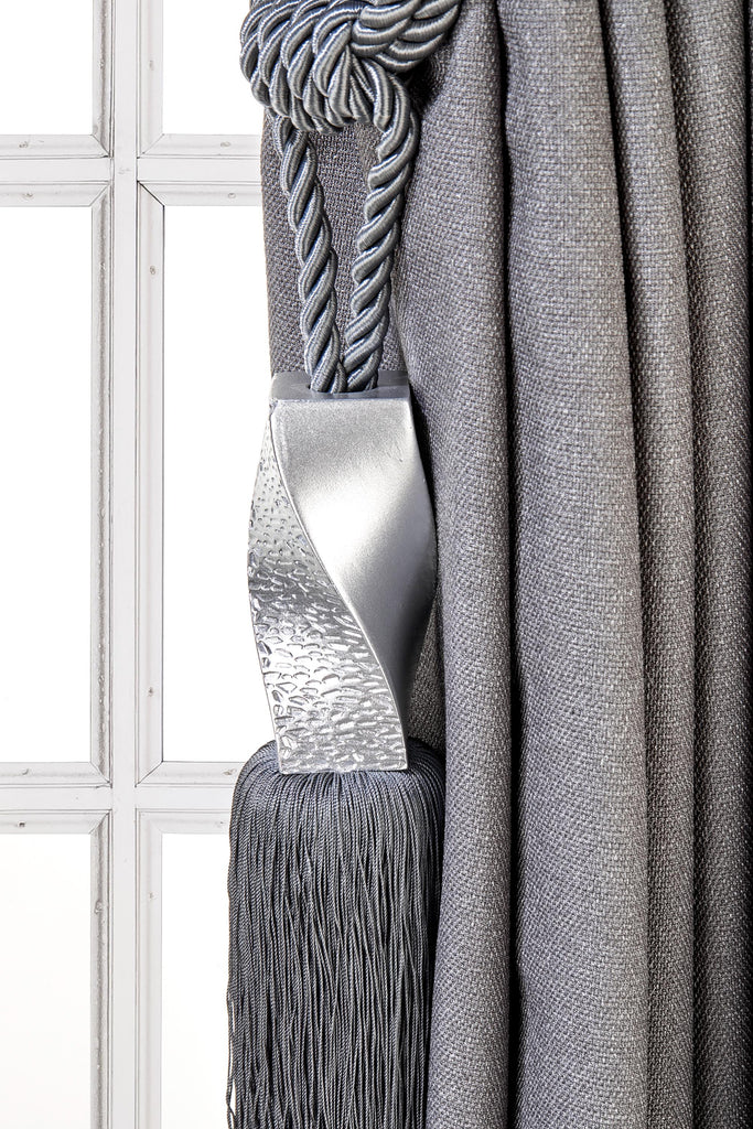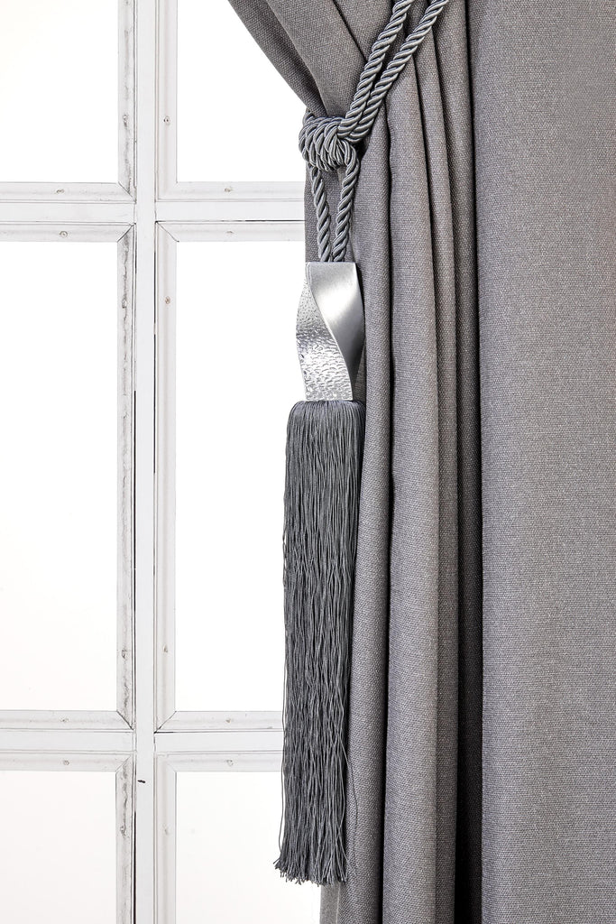 May include: A silver tassel tieback with a twisted metal design. The tassel is attached to a gray rope and is hanging from a gray curtain.